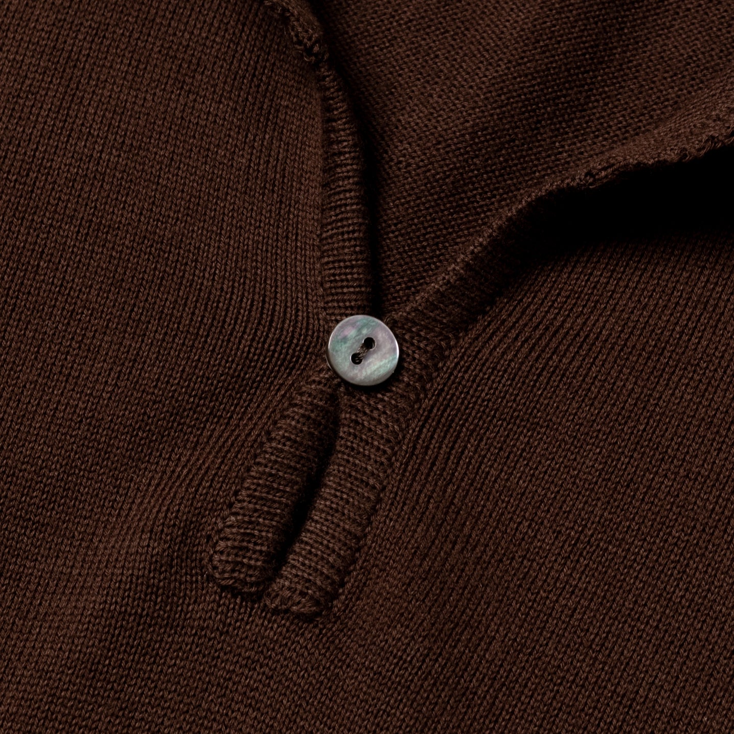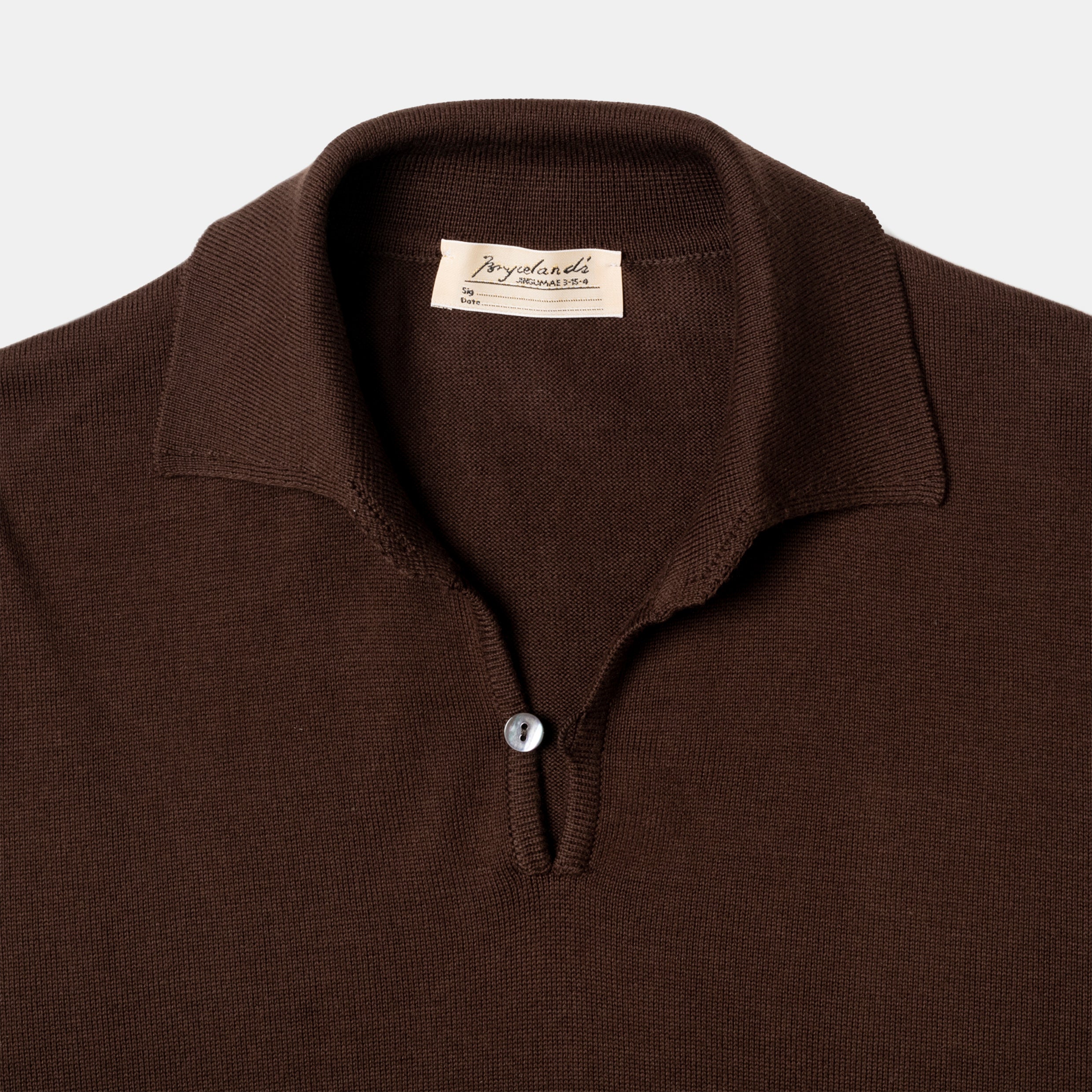 The collar sits above a short woven placket, with a single cats-eye mother-of-pearl button and loop. The knit of the cotton is soft and draped and lush, in shades elegantly mottled rather than a flat, neon sign primary. While they are woven in Scotland, they are born for elegant summer days – with a hank at the neck and bloused short over a pair of wide-leg flannels, it’s Cary Grant in To Catch a Thief.