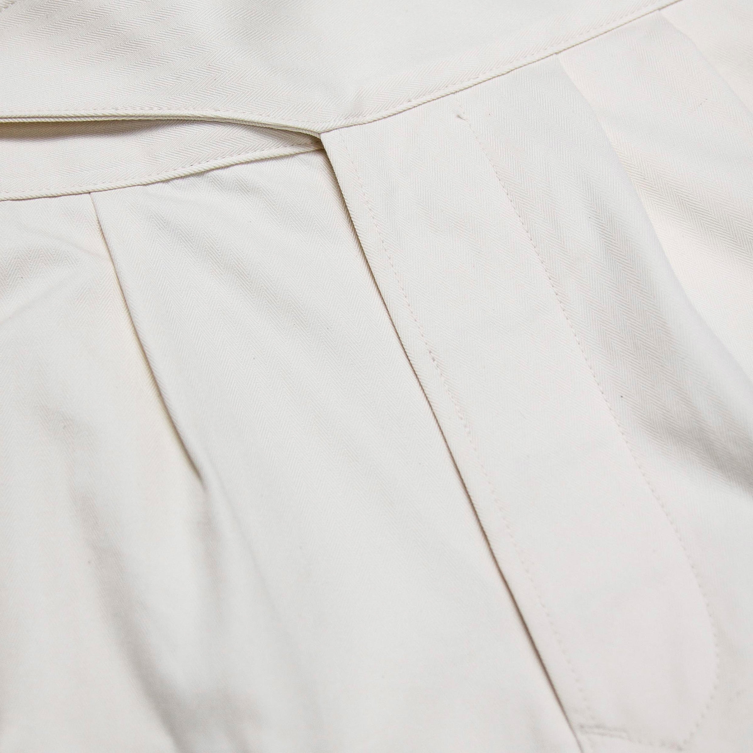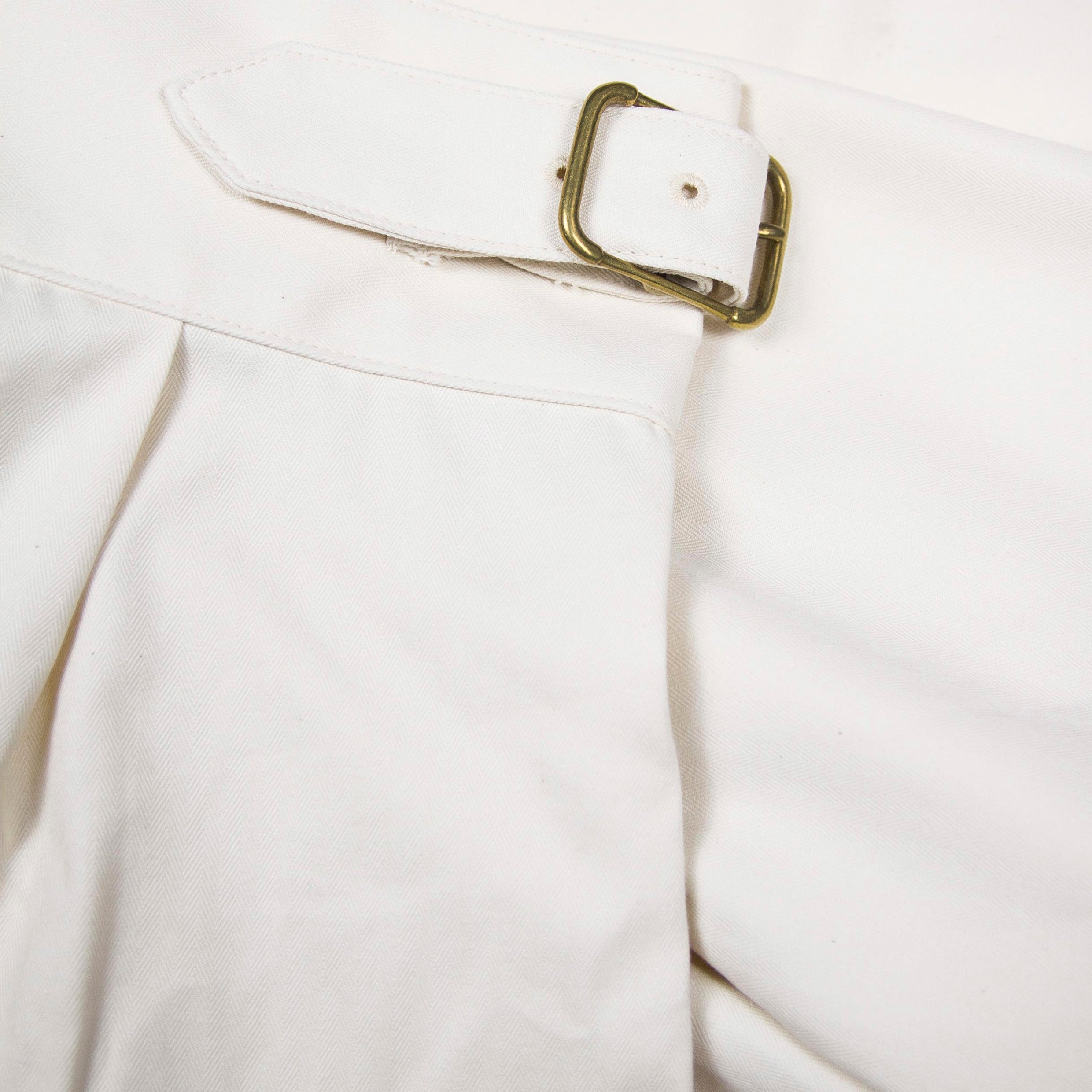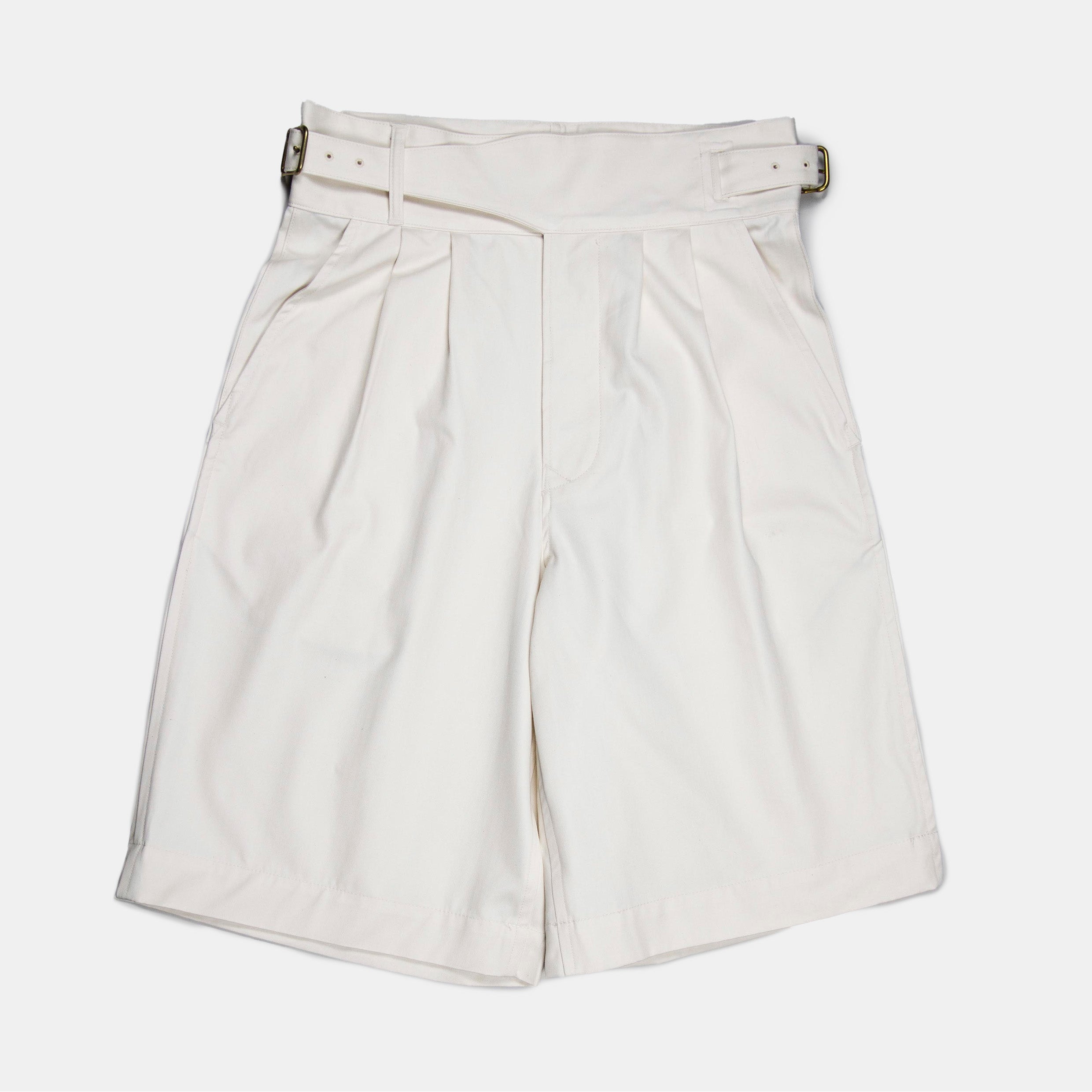 As reminiscent of 1940’s resort wear as it is steadfast British military garb, the high waisted and deep pleated form of the Gurkha short is breezy and louche, a juxtaposition of it’s almost feminine silhouette with its robust cloth and heritage. Ours are cut high, with the classic side fastening self belt waist, double pleats on the front and single pleats at back, and a wide leg that falls just past the knee without a turn up. Made in Japan from a heavy cotton twill, they are as hardy as their military past, and soften with each wash and wear to become a slouchy, draped garment to tackle the summer heat.