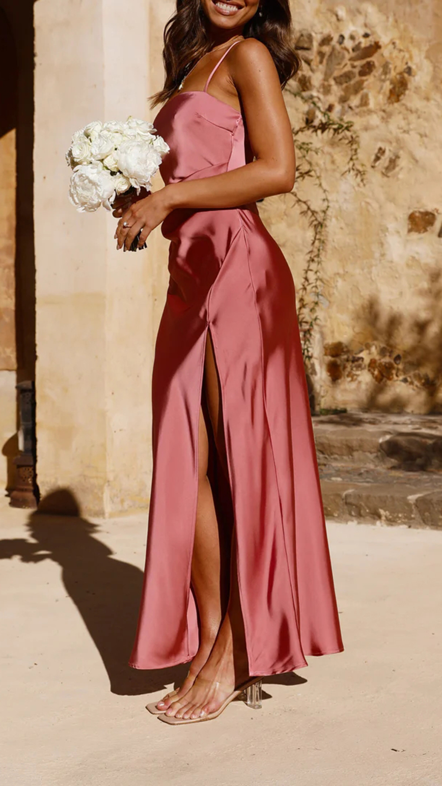 All eyes on you in our Ilana Maxi Dress. This simply elegant dress features a straight neckline, thin adjustable straps, leg split and subtle pleat detailing on waist. This style pairs beautifully with nude heels and dainty jewellery to achieve a beautifully finished look.
